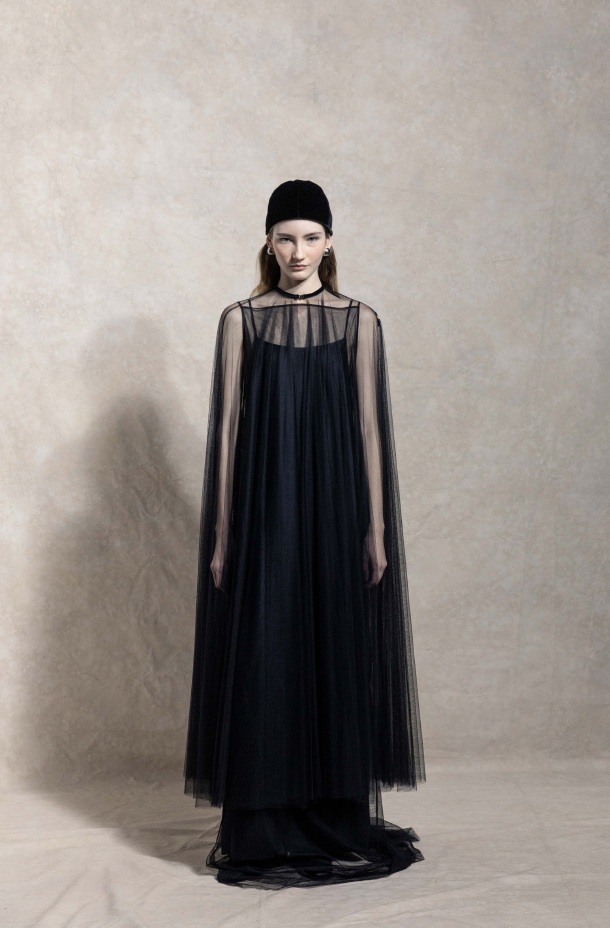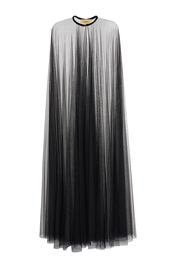 轻盈网纱伞状廓形,层次灵动梦幻。丝绒领圈饰边,质感对比,增添复古优雅。开放式斗篷设计,自然垂坠,提升造型层次。兼具实用与装饰,为正式场合增添戏剧感。面料A:桑蚕丝100%面料B:聚酯纤维91% 氨纶9%
