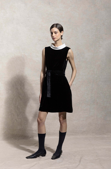 CURIEL经典赫本裙型,修身剪裁勾勒优雅身形,复刻50年代廓形。新型环保天鹅绒,柔软细腻,光泽优雅。黑白撞色领身设计,绗缝腰带勾勒曼妙曲线,展现复古女性魅力。修长袖型搭配丝绒质感,袖口内衬可翻折,兼具温暖与仪式感。面料A:粘纤66% 铜氨纤维32% 氨纶2%面料B:棉50% 锦纶47% 氨纶3%里料A:桑蚕丝91% 氨纶9%里料B:桑蚕丝100%
