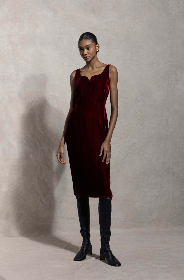 经典TUBINO廓形,曲线优雅勾勒身姿。· 高品质丝绒面料,光泽柔和高贵。· 心形领口设计,复古浪漫。· 典藏系列设计,致敬CURIEL时装经典。