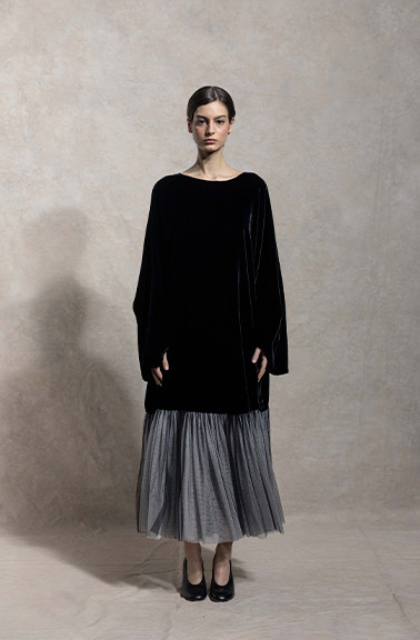 典藏系列经典廓形,灵感源于品牌档案。丝绸光泽与羊毛温暖交融,呈现多角度高级质感。深V心形领与裙摆,尽显意式曲线剪裁的精湛工艺。高级工艺打造,彰显晚礼服的精致与典雅。面料:绵羊毛90% 桑蚕丝10%里料:铜氨纤维100%
