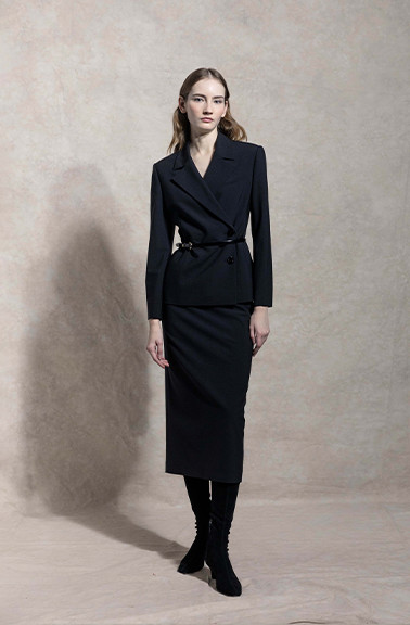 前片与裙身采用CURIEL黑丝绒,低调奢华,彰显品牌魅力。后背金色印花面料,CURIEL archive手稿图案,传递品牌传承。腰部可调节金色腰带,自由塑造身形。双排丝绒扣搭配金色CURIEL logo,黑金配色,精致优雅。面料A:底布:铜氨纤维100% 绒纱:粘纤100%面料B:桑蚕丝100%