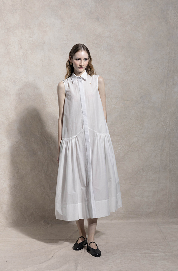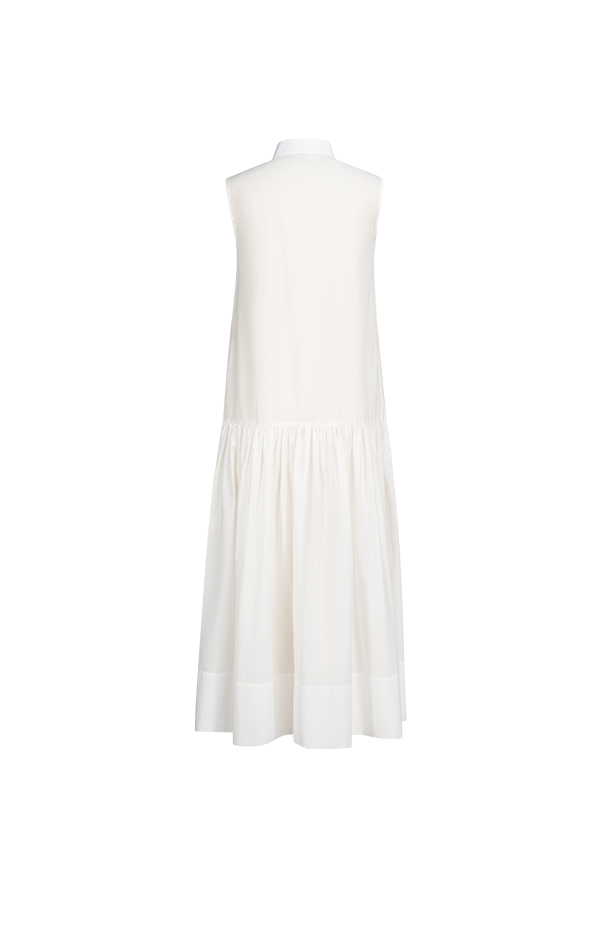 白色无袖设计,简约清新,适合春夏穿着。衬衫领口优雅正式,适应多场合。捏褶裙摆增添动感,凸显流畅线条与女性气质。柔软面料舒适,内附白色吊带,现代感十足。面料:外裙:棉71% 锦纶29%里料:内裙:桑蚕丝91% 氨纶9%