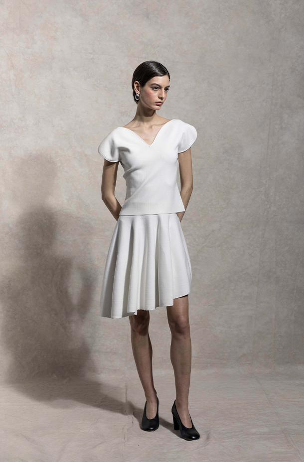 V领心形设计,修饰颈部线条,优雅气质。自然延伸袖型,减少拼接,流畅舒适。弹性贴合曲线,凸显身形兼具柔软。清爽白色百搭,适配正式与休闲场合。纱线:粘纤61% 聚酯纤维39%