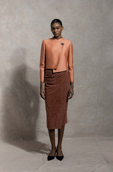 高档丝毛混纺面料,轻盈柔软,垂坠自然,勾勒优雅身形。袖口对褶配银线装饰,光影间闪烁精致动感。船领设计优雅包容,衬托肩部线条。宽松剪裁,兼具日常舒适与特殊场合风格。面料:绵羊毛73% 桑蚕丝27%