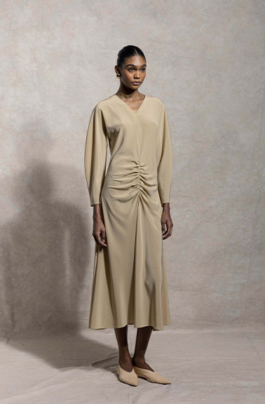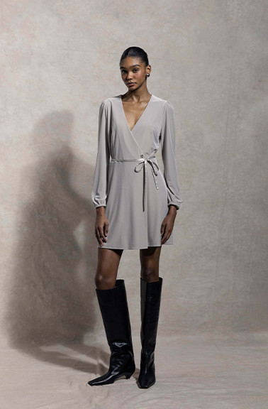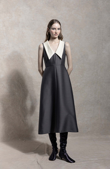 HEPBURN经典版型短款连衣裙,丝毛混纺材质,精致优雅。生丝与羊毛交织,丝绸光泽与羊毛温暖,多角度呈现高级质感。50年代经典裙型,意式弧线剪裁考究精致。翻边领立体有型,衬托颈部优美线条。面料:绵羊毛90% 桑蚕丝10%里料:铜氨纤维100%