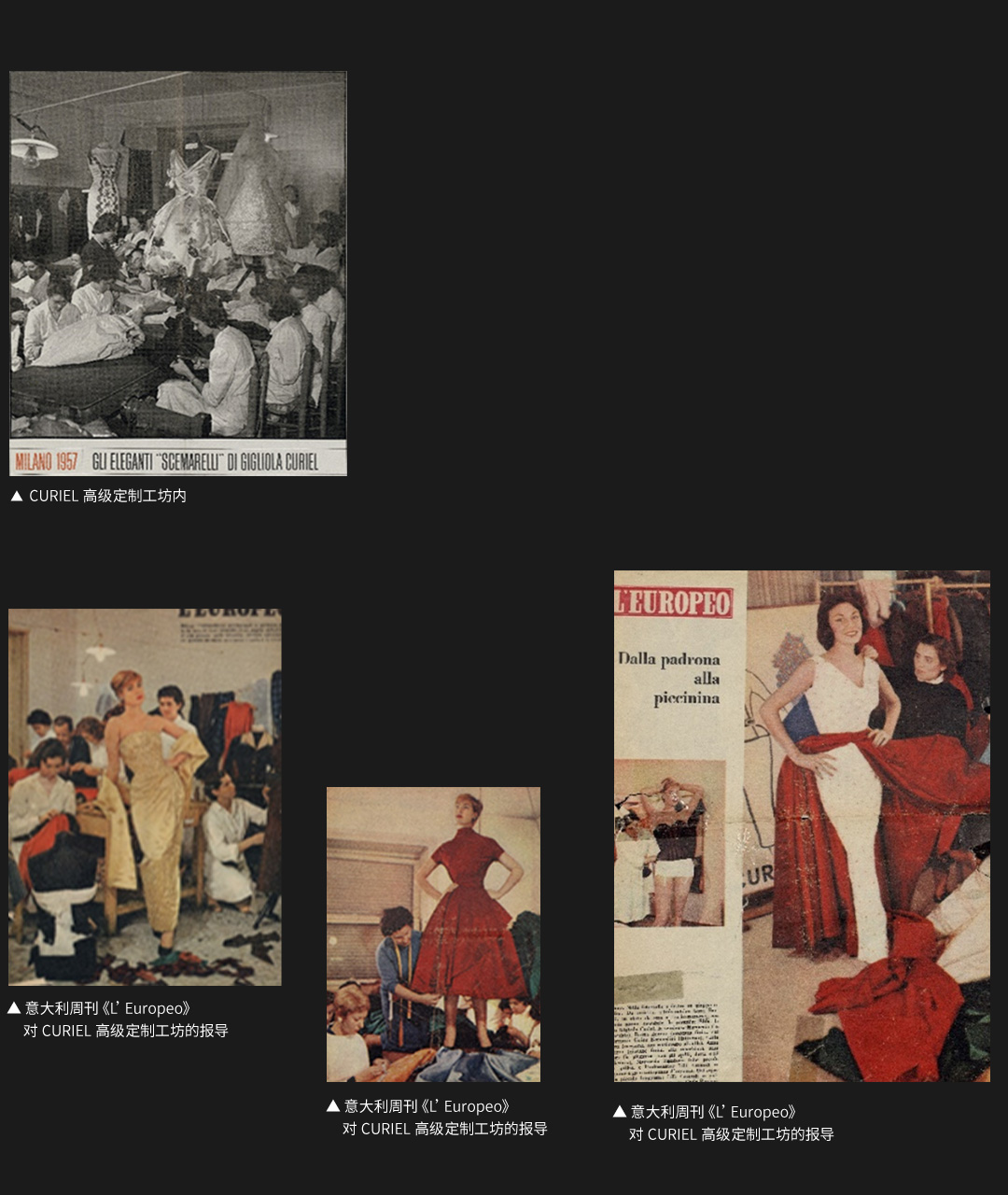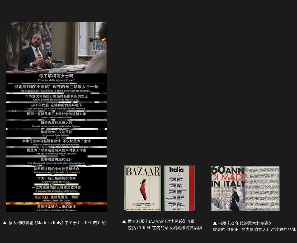 意大利时装剧《Made in Italy》第四集:“CURIEL小黑裙米兰姑娘人手一件。”百余年间,CURIEL与一众时装史上的重要玩家一起推动了意大利制造的发展,并将意大利高级定制Alta Moda推向世界。