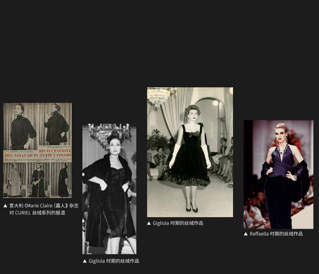 CURIEL对丝绒的持续探索始于Gigliola女士执掌品牌的时期,并沿袭至今。意大利《Marie Claire》嘉人杂志曾评论道:“Gigliola Curiel对使用丝绒面料的使用和掌控可谓一流。在日常搭配中,丝绒一直是女性极端优雅的象征,同时兼具实用性,是非常理想的面料。”