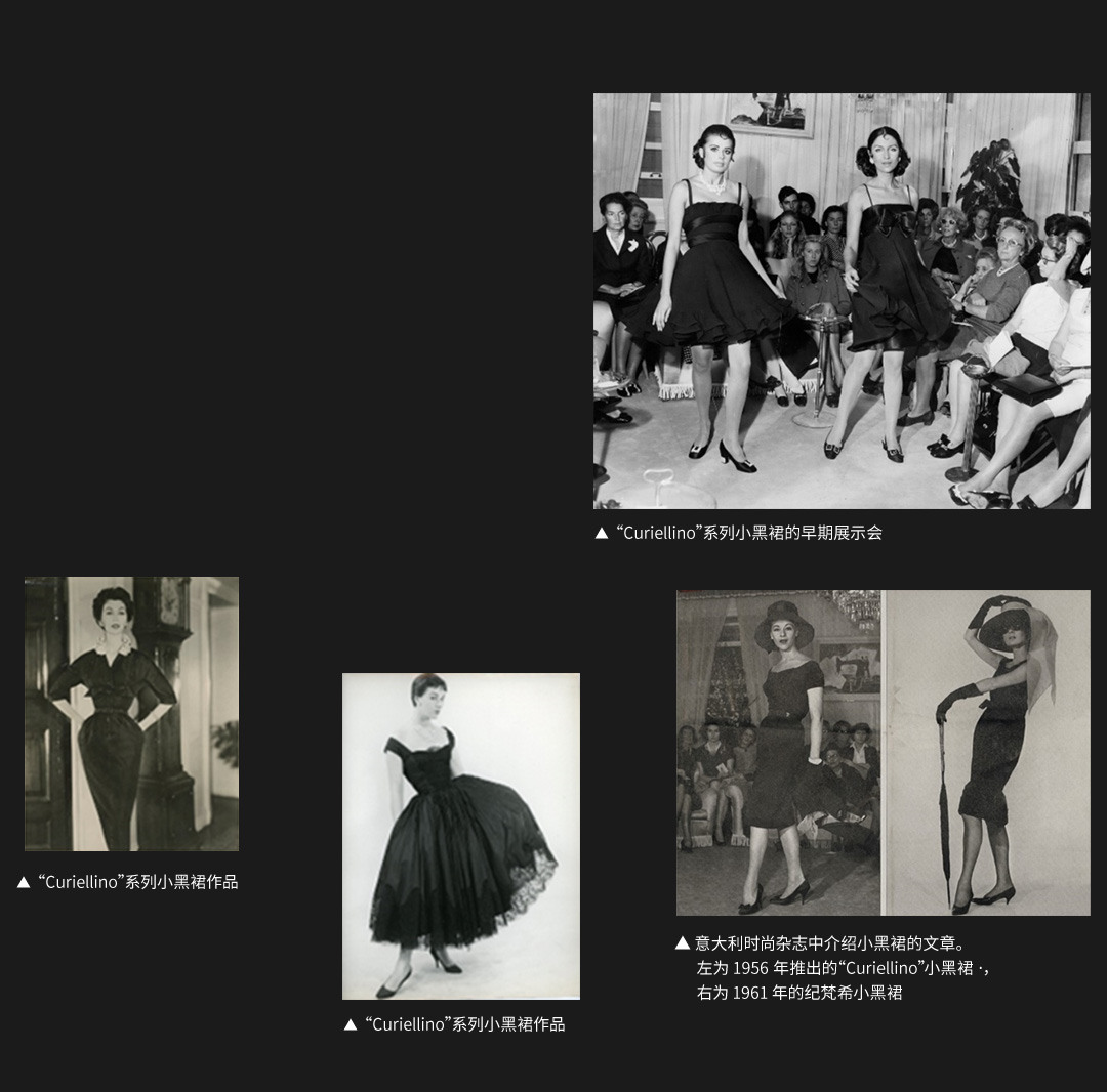 随着战后现代职业女性的增多,小黑裙开始风靡欧洲。1956年,Gigliola女士推出了划时代的“Curiellino”系列小黑裙并成为风潮,被评价为“米兰女孩人手一件”的时尚单品。