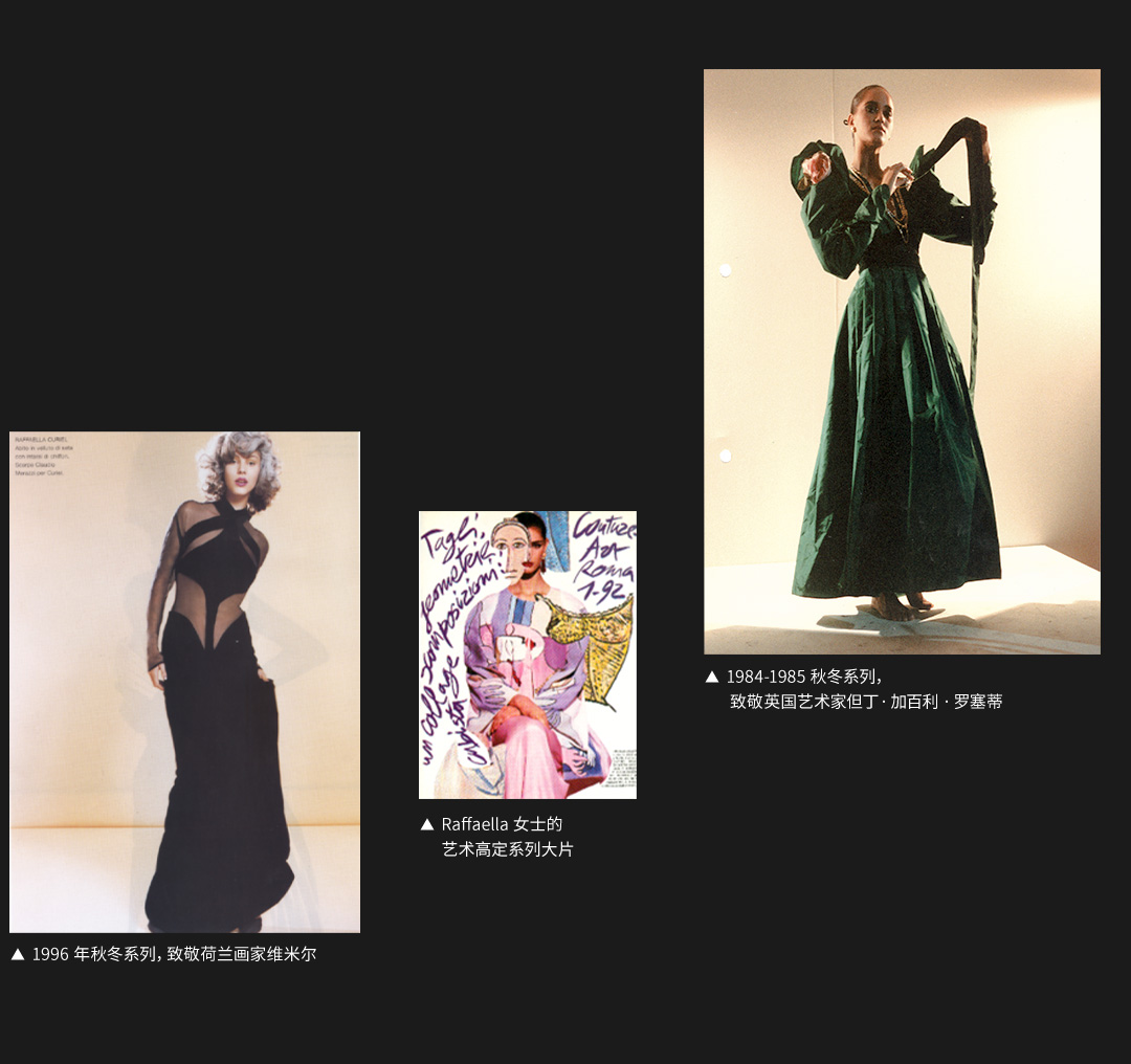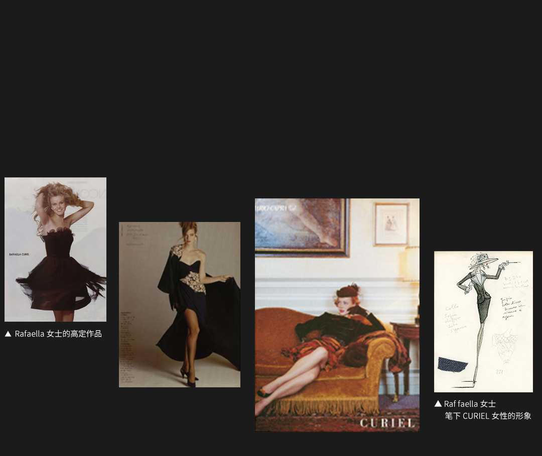 1984年,Raffaella女士开始了长达十余年的Tribute to Art艺术高定系列的创作,以Alta Moda致敬杰出的自由艺术家。凭借该系列的成就,CURIEL品牌被带领之巅峰。Raffaella女士也成为了第一位被意大利政府授予最高荣誉“共和国大十字骑士勋章”的女性设计师。