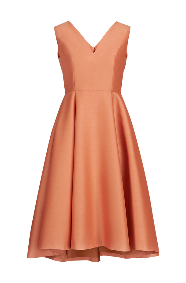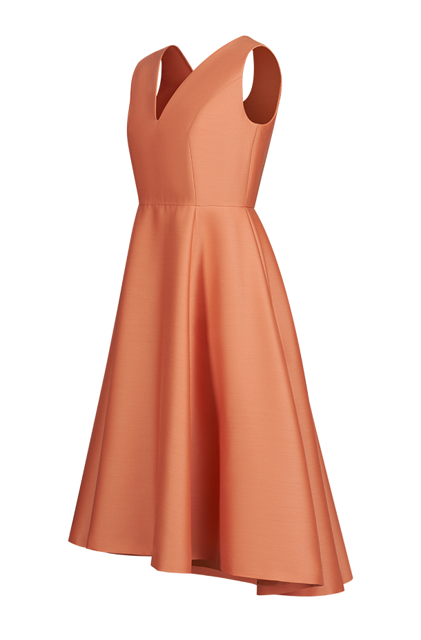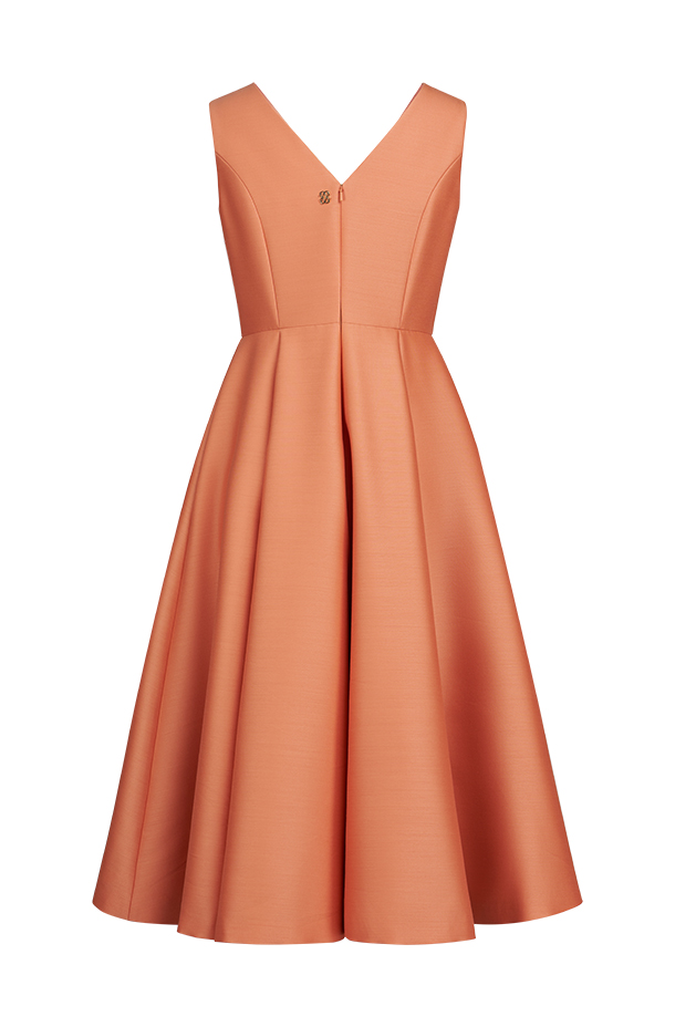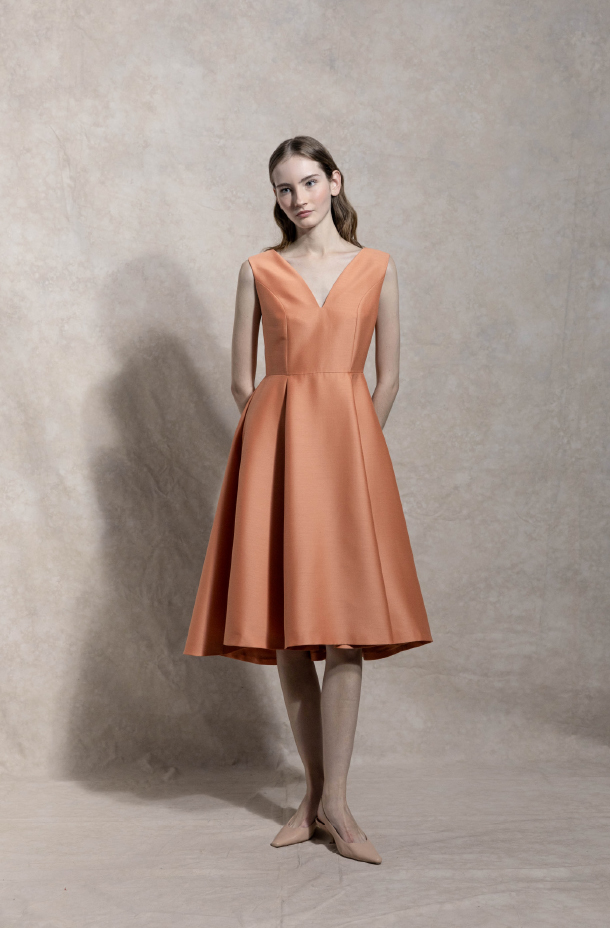 典藏系列经典廓形,灵感源于品牌档案。· 丝绸光泽与羊毛温暖交融,呈现多角度高级质感。· 深V心形领与裙摆,尽显意式曲线剪裁的精湛工艺。· 高级工艺打造,彰显晚礼服的精致与典雅。