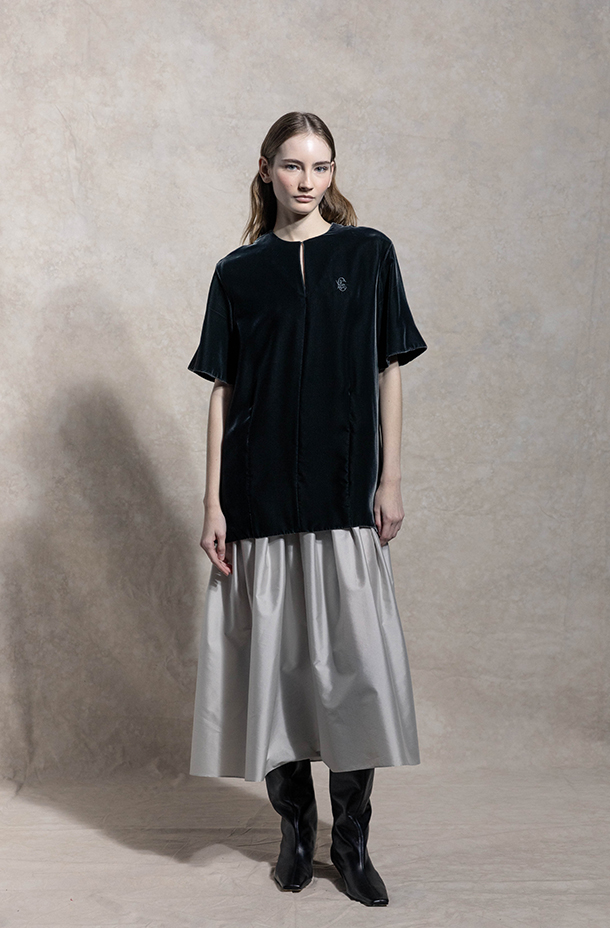 长裙设计,营造慵懒浪漫气质。· 深灰浅灰拼色,高级丝绒与轻薄丝光棉布拼接,层次分明,混搭风格独特。· 领口迷你挂钩设计,可闭合或呈小V领。· 多场合适穿,通勤、休闲或派对皆可展现自在风格。