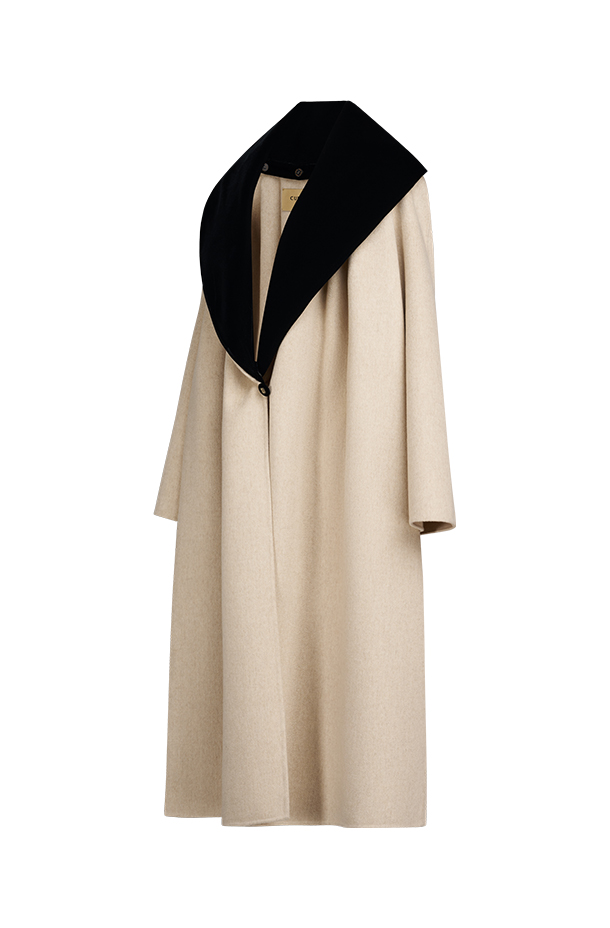 高品质双面羊毛呢,保暖又轻盈。黑丝绒翻领可拆卸,穿搭灵活多变。黑米撞色设计,经典耐看。适配多场景,兼具日常与通勤氛围。面料A:山羊绒100%(连接线除外)面料B:粘纤66% 铜氨纤维32% 氨纶2%