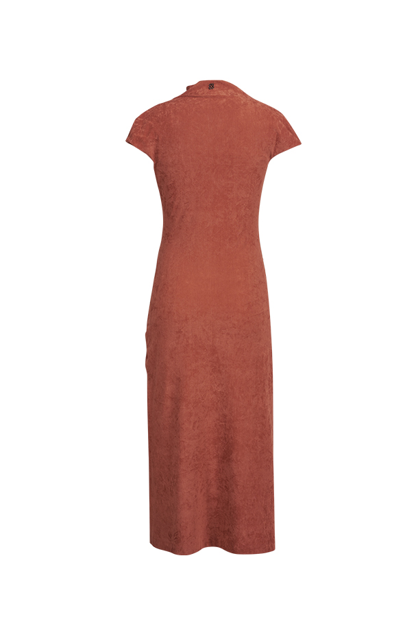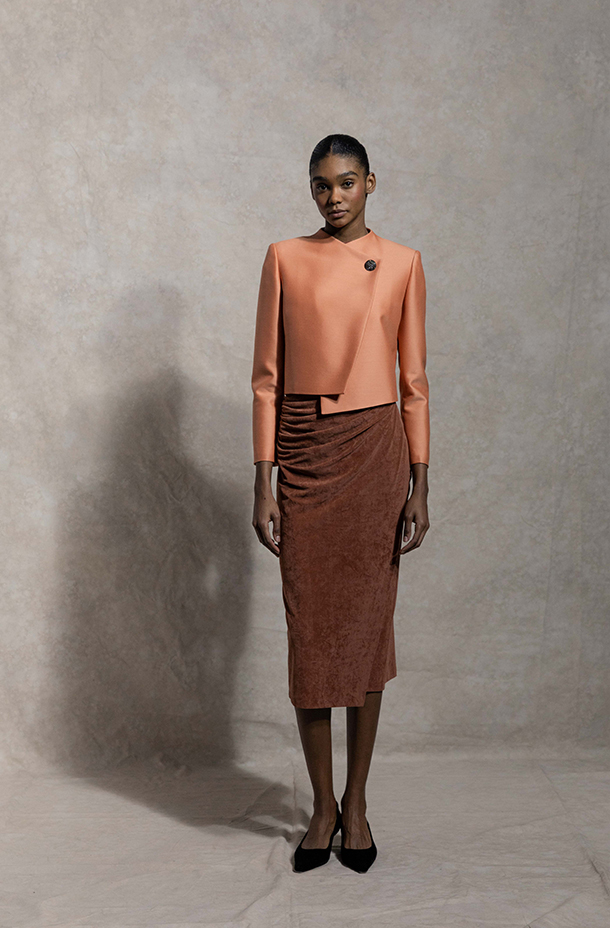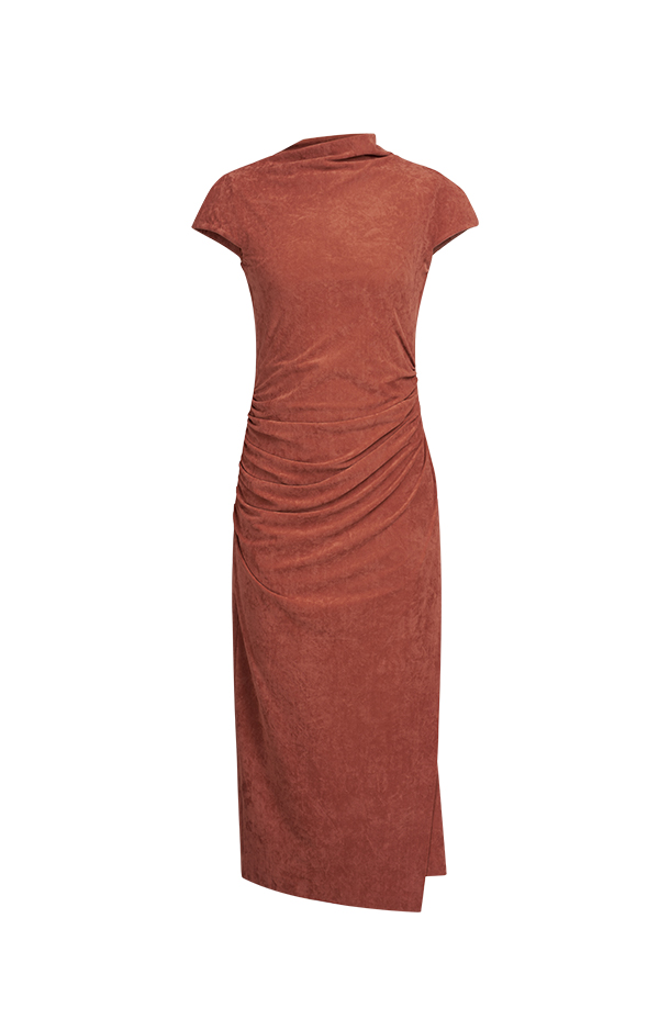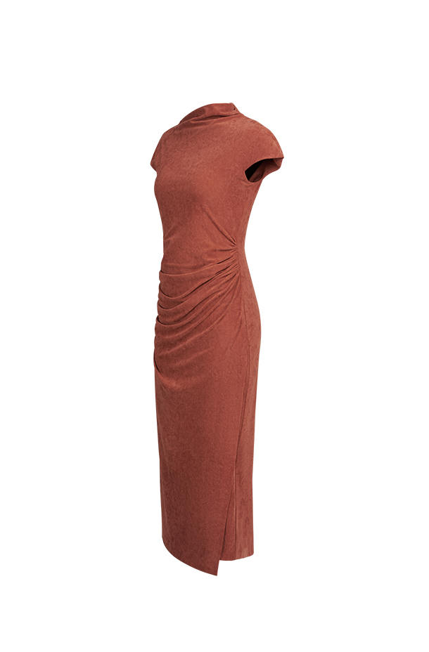 弹力麂皮绒面料,柔软舒适,高弹贴合身形。· 脏橘色调,温暖且富有个性时尚感。· 独特褶皱设计,呈现立体雕塑感。· 小连肩袖与斜裁领型,别致独特,增强视觉层次。
