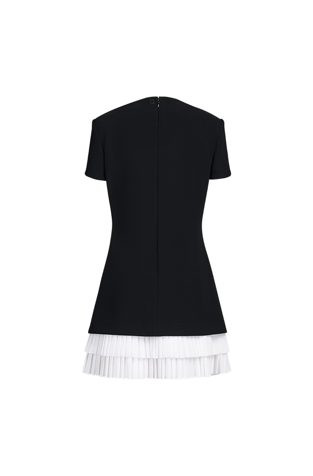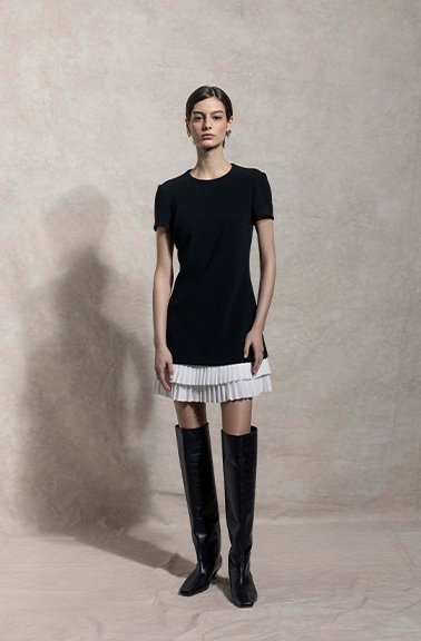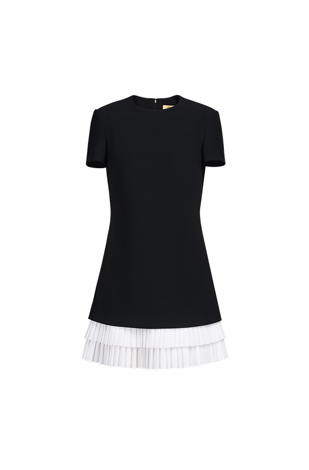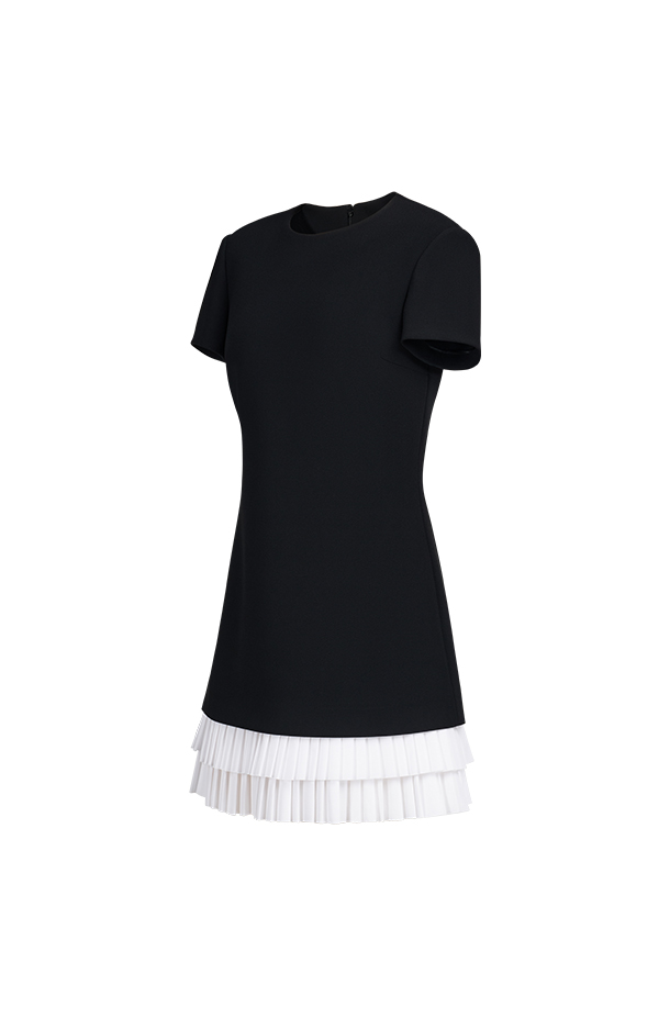弹力针织面料柔软亲肤,穿着自在无束缚。· 轻盈A字剪裁自然修饰腰胯曲线,展现利落优雅身姿。· 裙摆白色百褶增添层次感与动态美,活泼且柔美。· 低调黑色结合运动面料,兼具休闲感与时尚韵味。