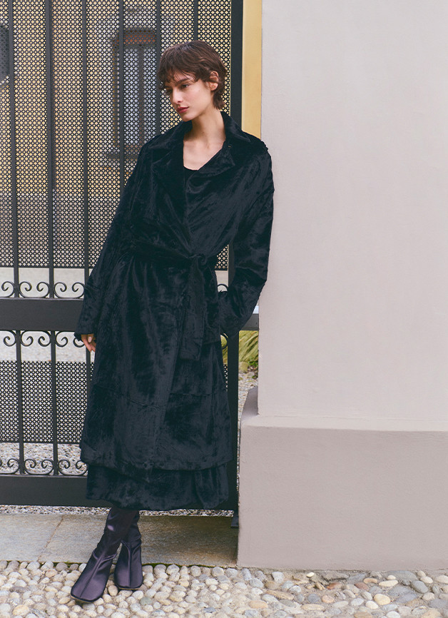 每一件作品皆承载意大利生活的诗意叙事——从晨间咖啡馆卡布奇诺的氤氲香气,到古老歌剧院的月夜华章,皆可从容流转。精湛剪裁与珍稀面料相映成辉:定制天鹅绒流淌着皮草般的柔润光泽;格纹亮面丝绒折射珠宝级的璀璨华彩;双面灰羊毛与海军蓝棉绒大衣镌刻永不褪色的复古格调。
